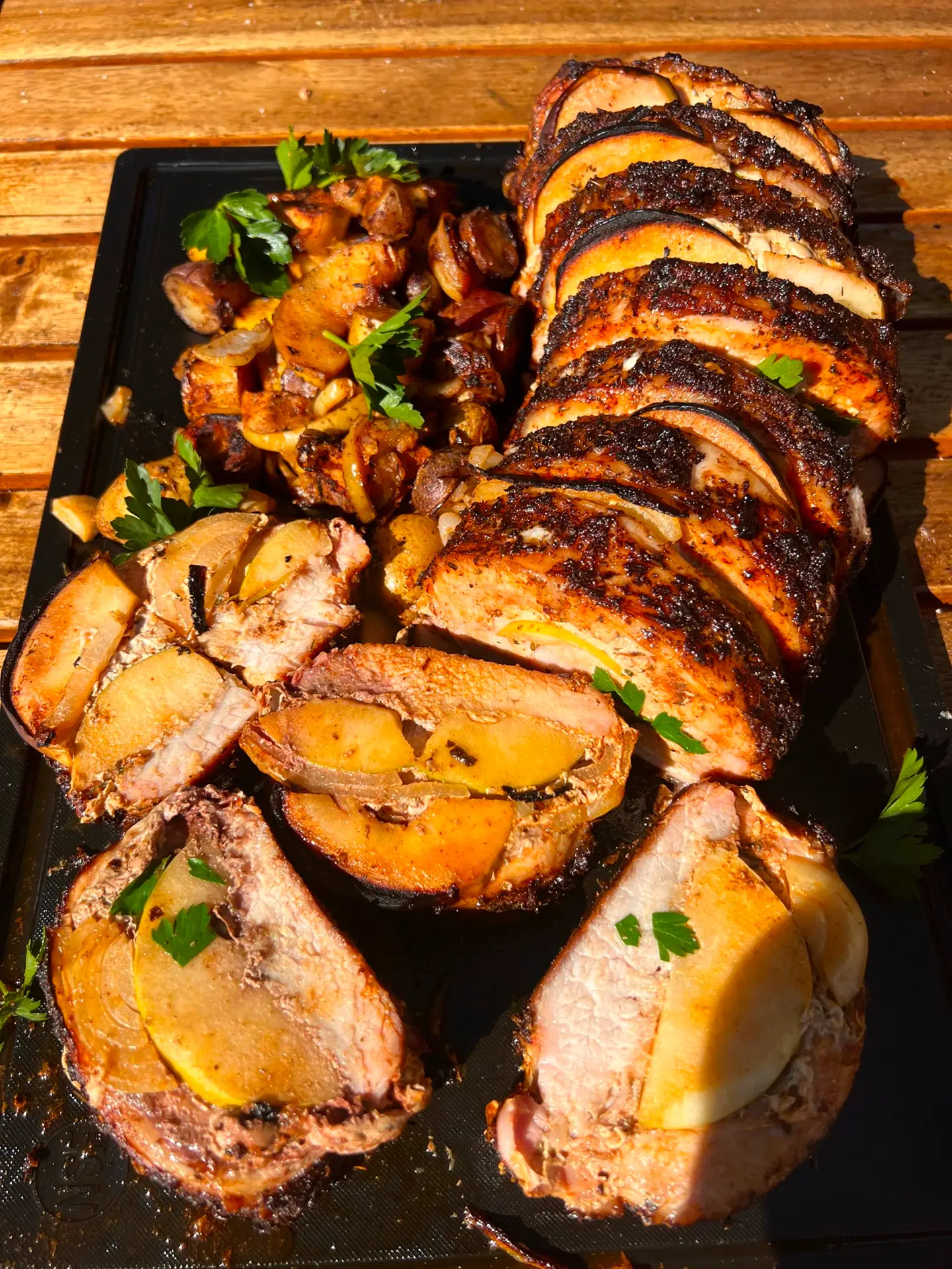 In an aluminum tray, add the quartered apples, potatoes and onions, cover in about 2 tbsp of oil and season with the same seasoning used on the pork loin.